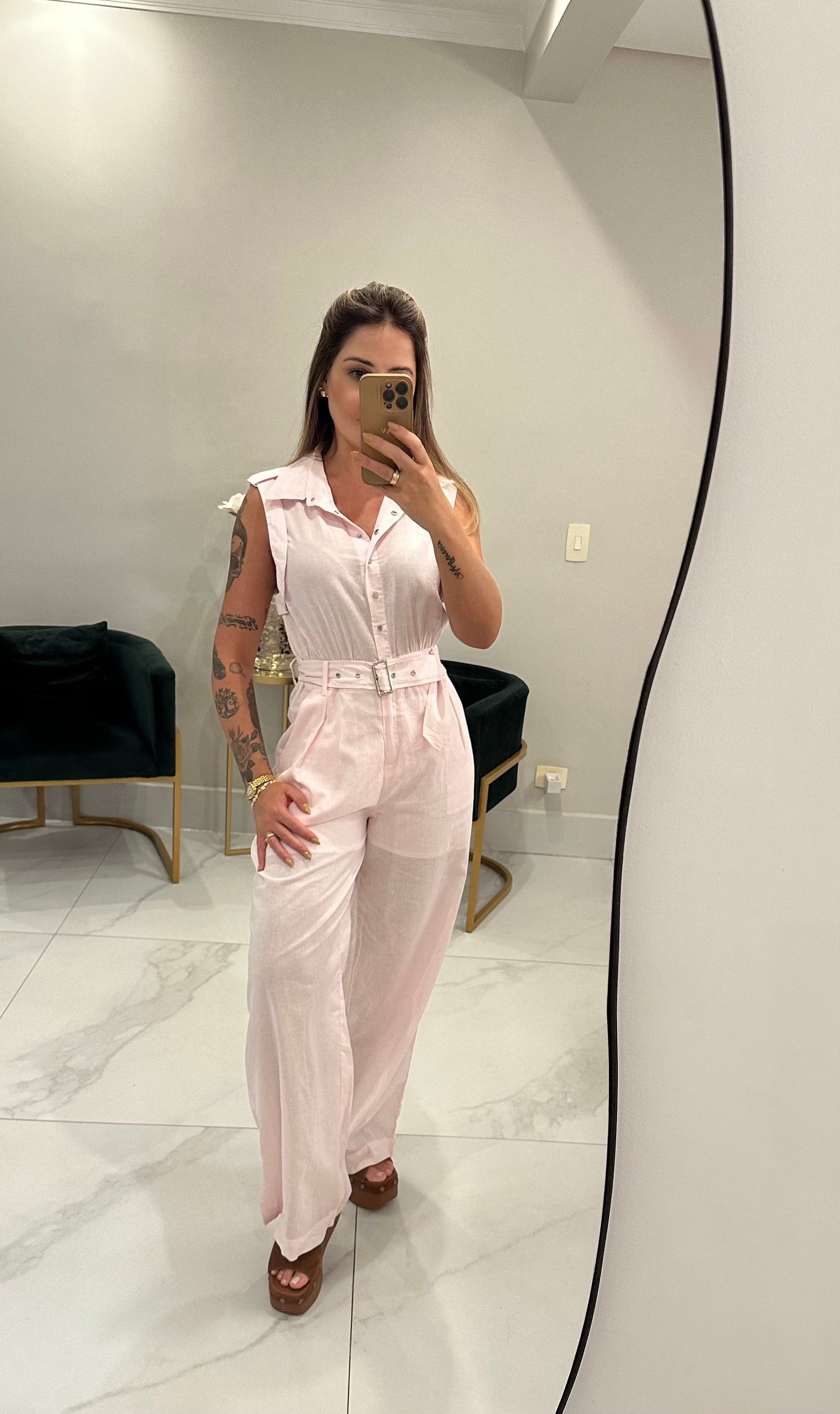 Macacão em Linho com Botões, Cinto e Gola Polo Elegância e Conforto em Uma Peça Só